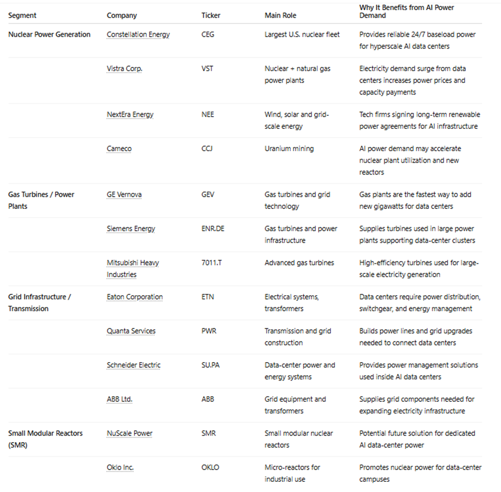 Electricity demand from AI data centers could double U.S. power demand growth over the next decade, which is why these sectors are becoming major equity themes.