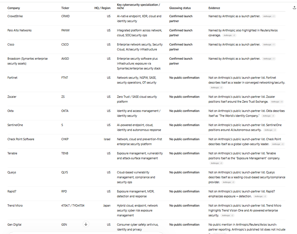 Although Anthropic has not publicly disclosed a full partner list for its "Project Glasswing", the next table offers an overview of the Cyber Security industry key players with a last column highlighting "Yes/Probable" for those players that have been reported participation or strong likelihood based on enterprise partnerships and mentions in coverage: