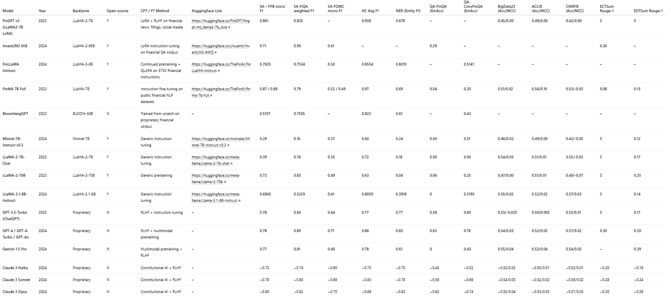 HC Avg F1: Average F1 score for categorizing financial news headlines into predefined topic classes (e.g., corporate actions, market movements).
