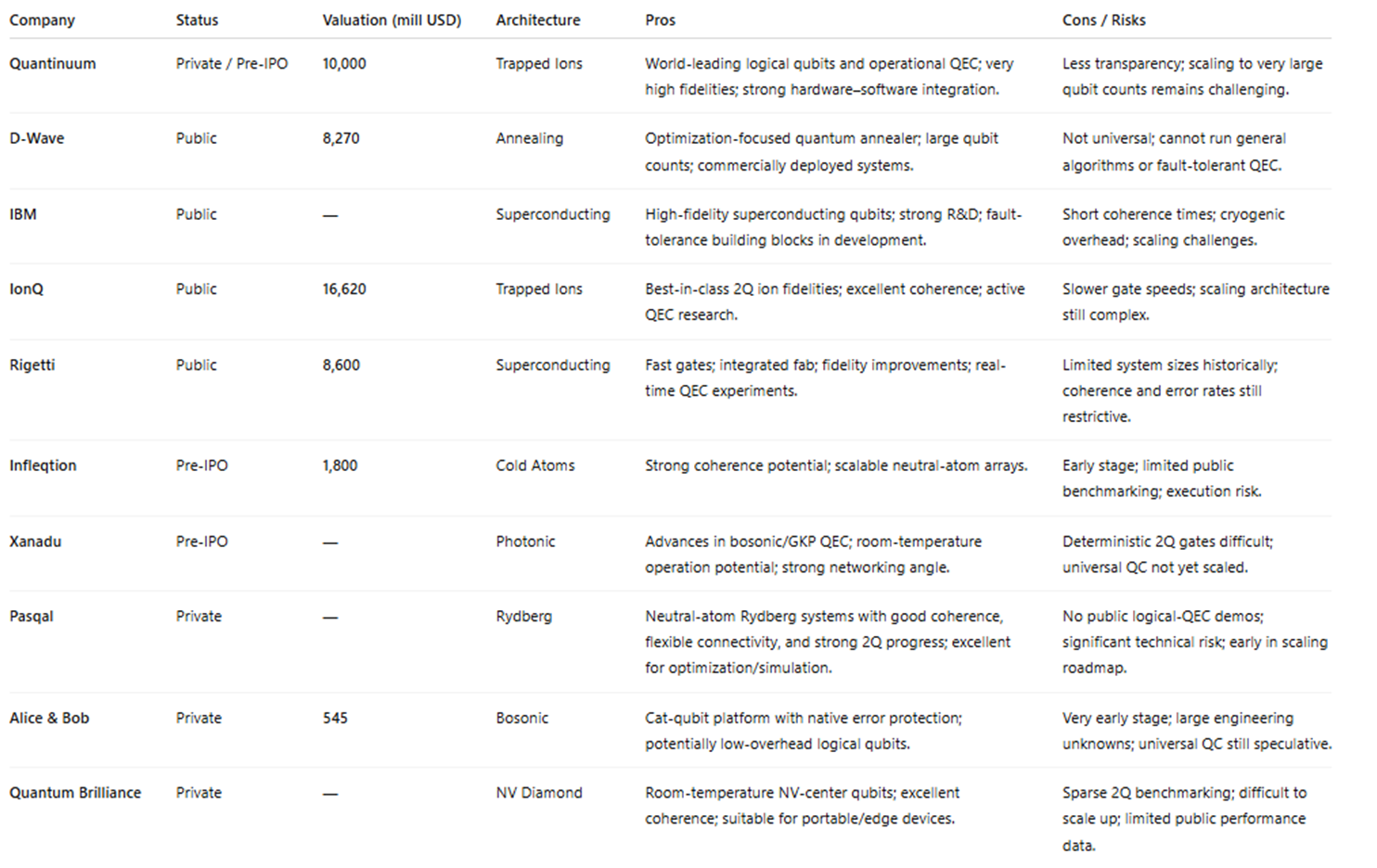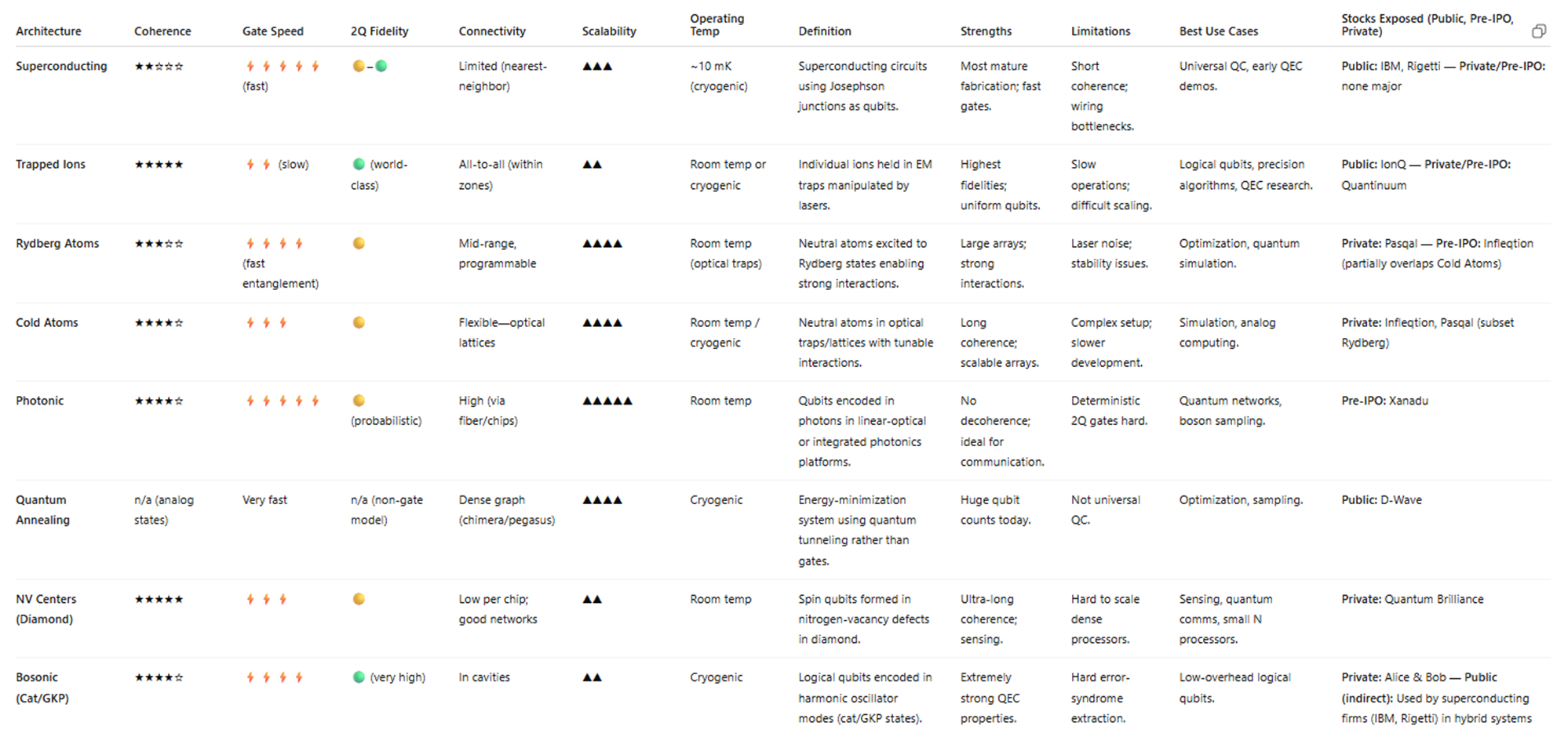 The tables below provide an overview of the principal companies in the sector—public and private—accompanied by short definitions for clarity, and concluding with a Quantum Architecture summary.